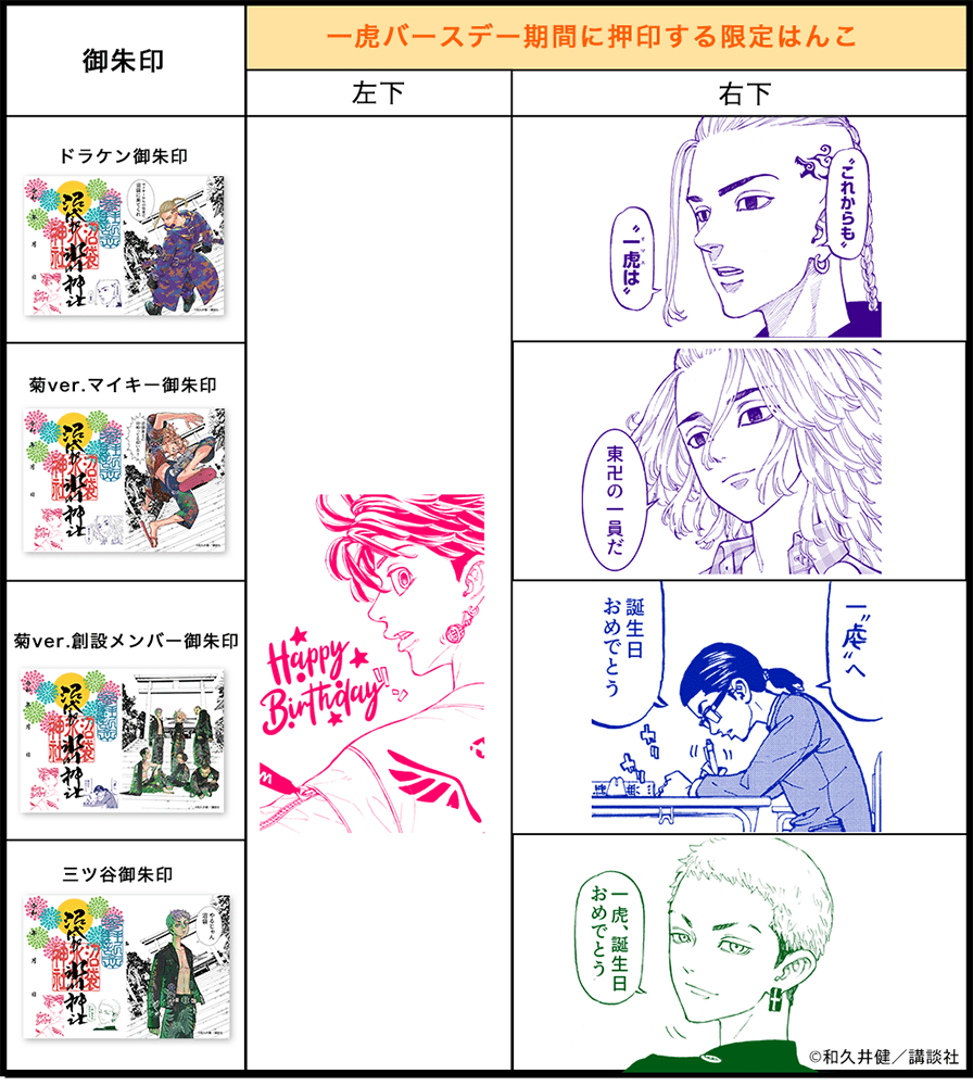 漫画『東京卍リベンジャーズ』内で、当社がモデルとなったシーンに登場するキャラクターの中から、ゆかりのあるキャラクターをピックアップし、誕生日を記念した御朱印を頒布予定です。