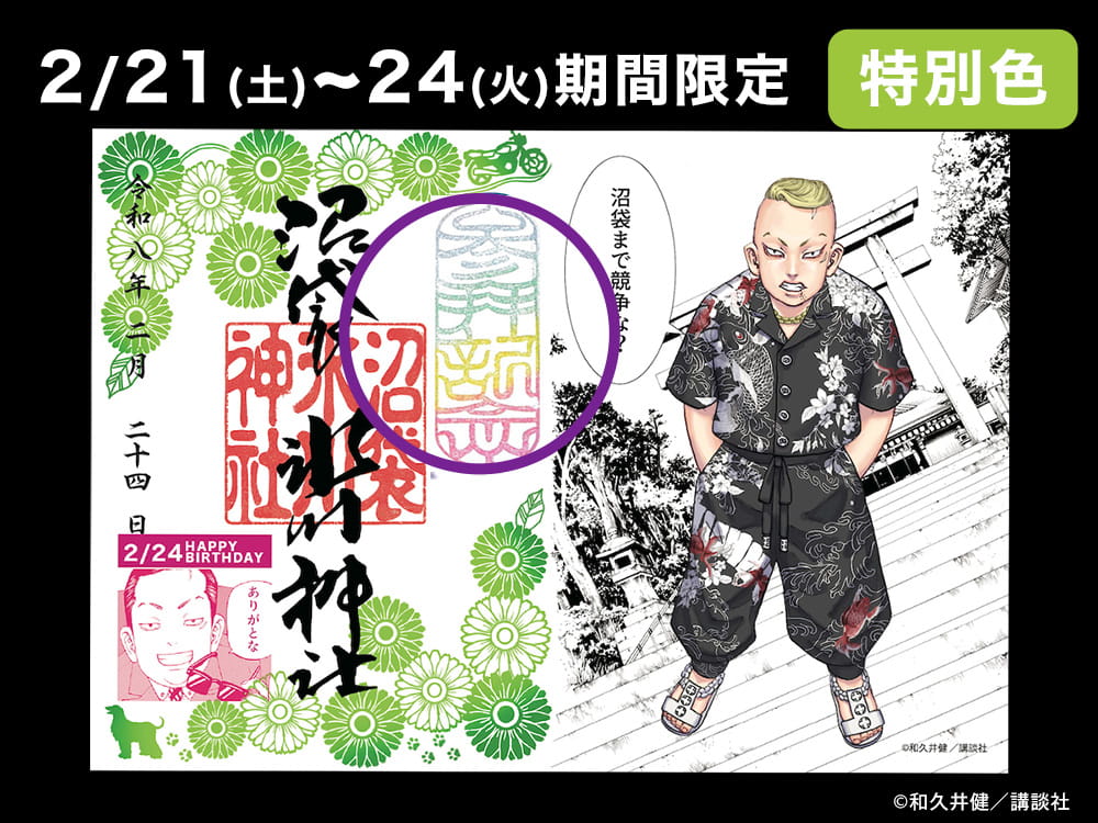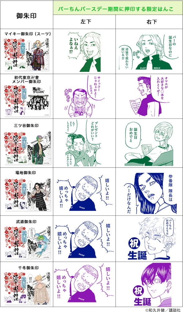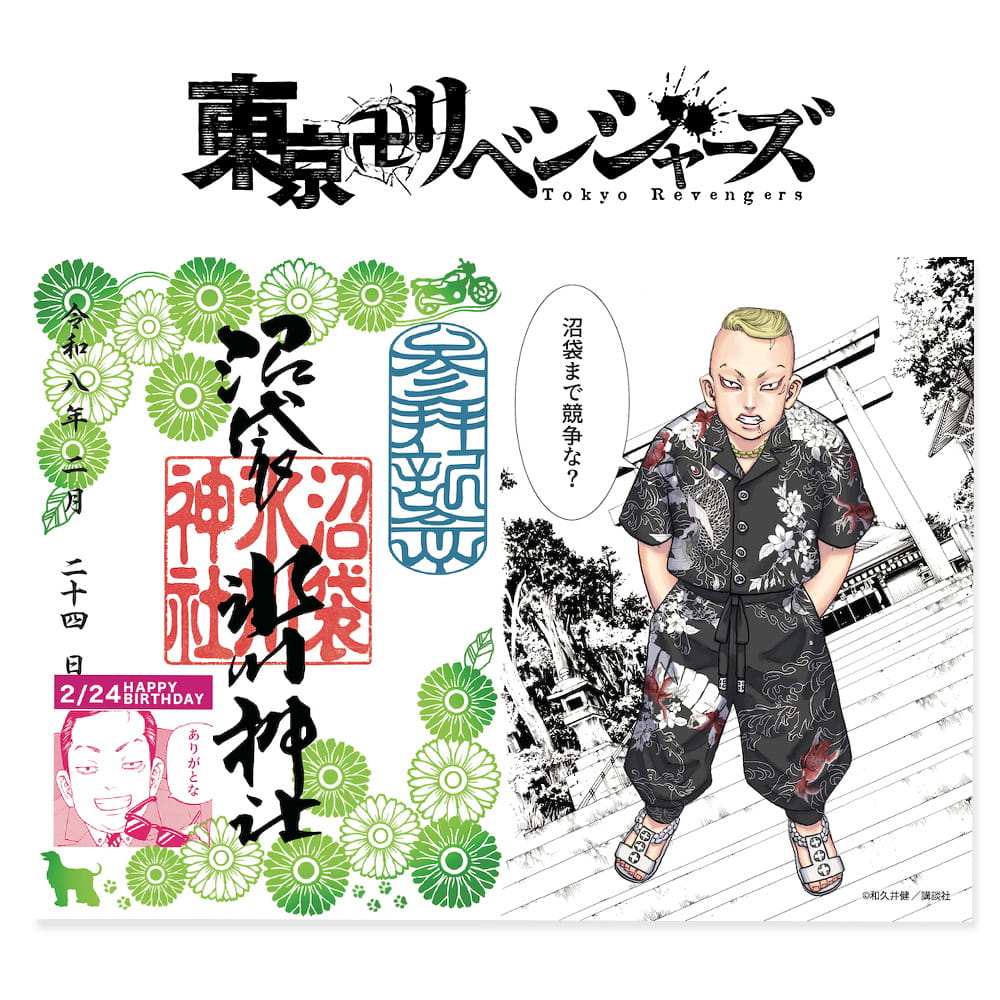 漫画『東京卍リベンジャーズ』内で、当社がモデルとなったシーンに登場するキャラクターの中から、ゆかりのあるキャラクターをピックアップし、誕生日を記念した御朱印を頒布予定です。